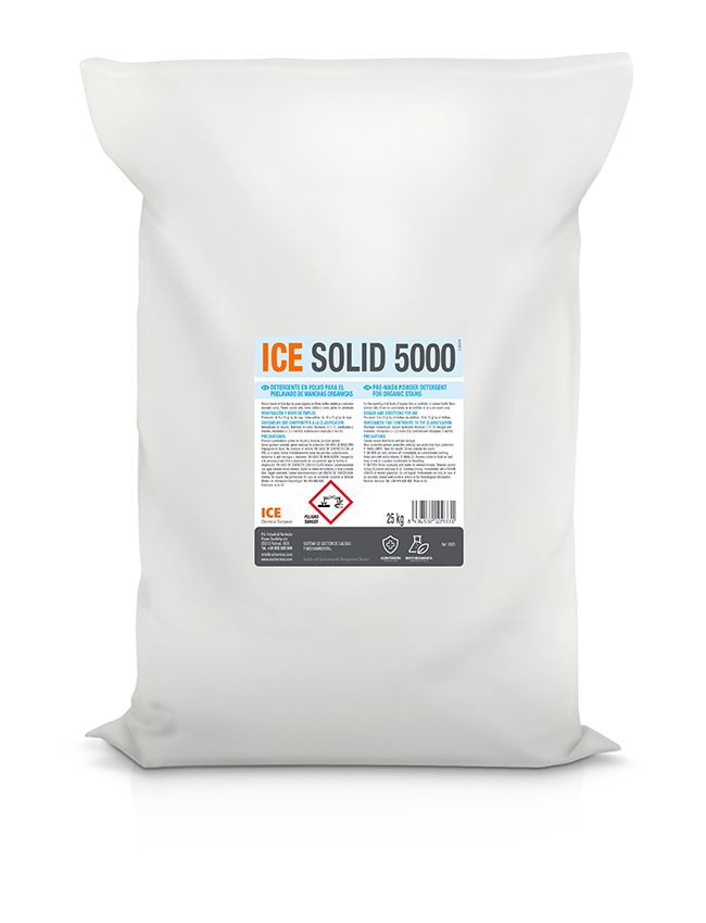 Detergente sólido para el lavado de todo tipo de grasa orgánica en fibras textiles, sintéticas o naturales excepto la seda. Producto polivalente que puede usarse solo, como aditivo o como jabón de prelavado.